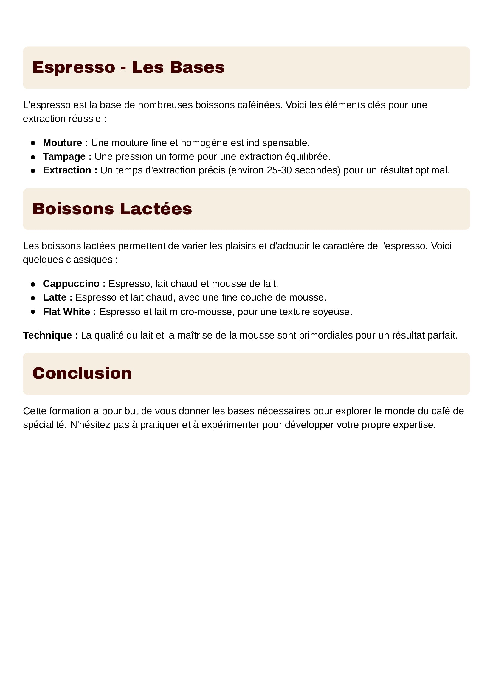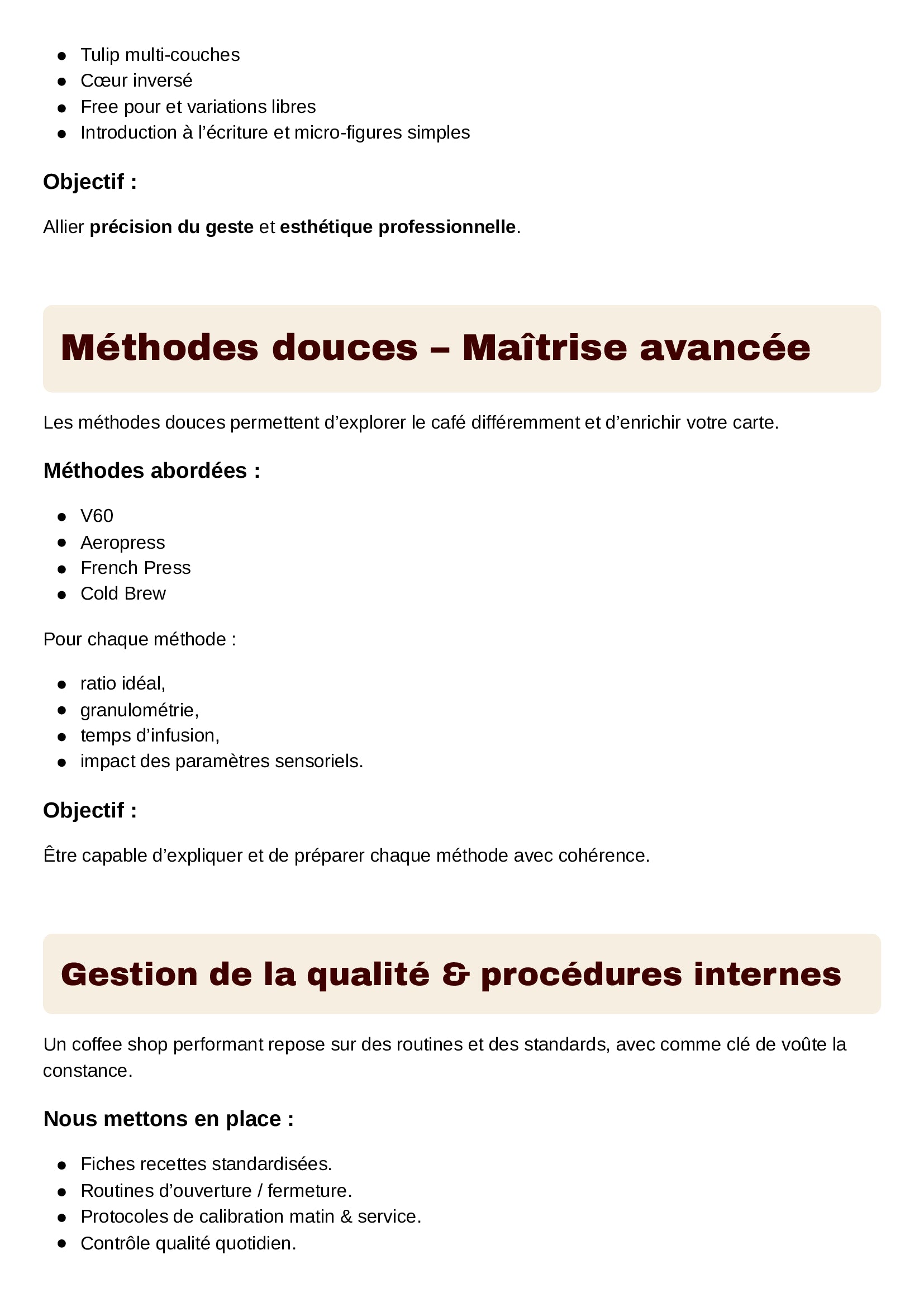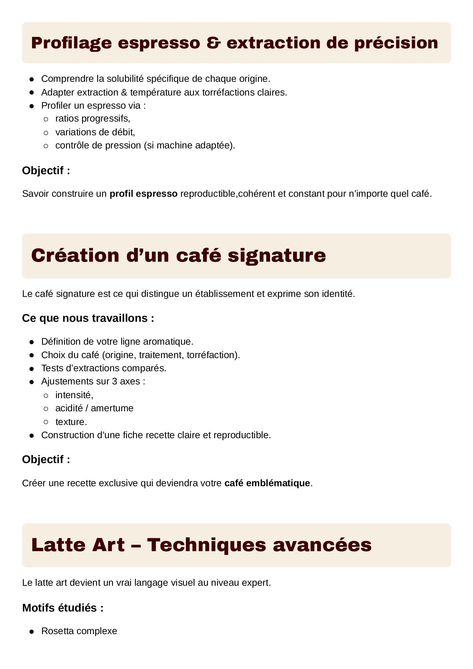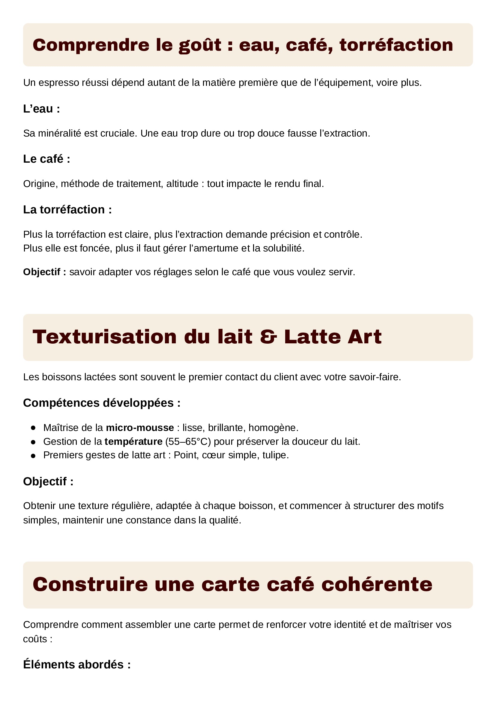 Au-delà de la fourniture des meilleurs grains, nous vous donnons les clés pour exceller dans la préparation. En tant que professionnels, vous avez accès à notre Académie Barista, proposant des formations complètes allant du Niveau I au Niveau III. Que vous souhaitiez former une nouvelle recrue aux bases de l'extraction, ou perfectionner vos baristas experts sur l'art du Latte Art et la gestion d'un moulin de précision, nos modules sont conçus spécifiquement pour vous. Investissez dans la compétence de vos équipes pour transformer chaque tasse en une expérience mémorable et garantir une qualité de service irréprochable à votre clientèle.