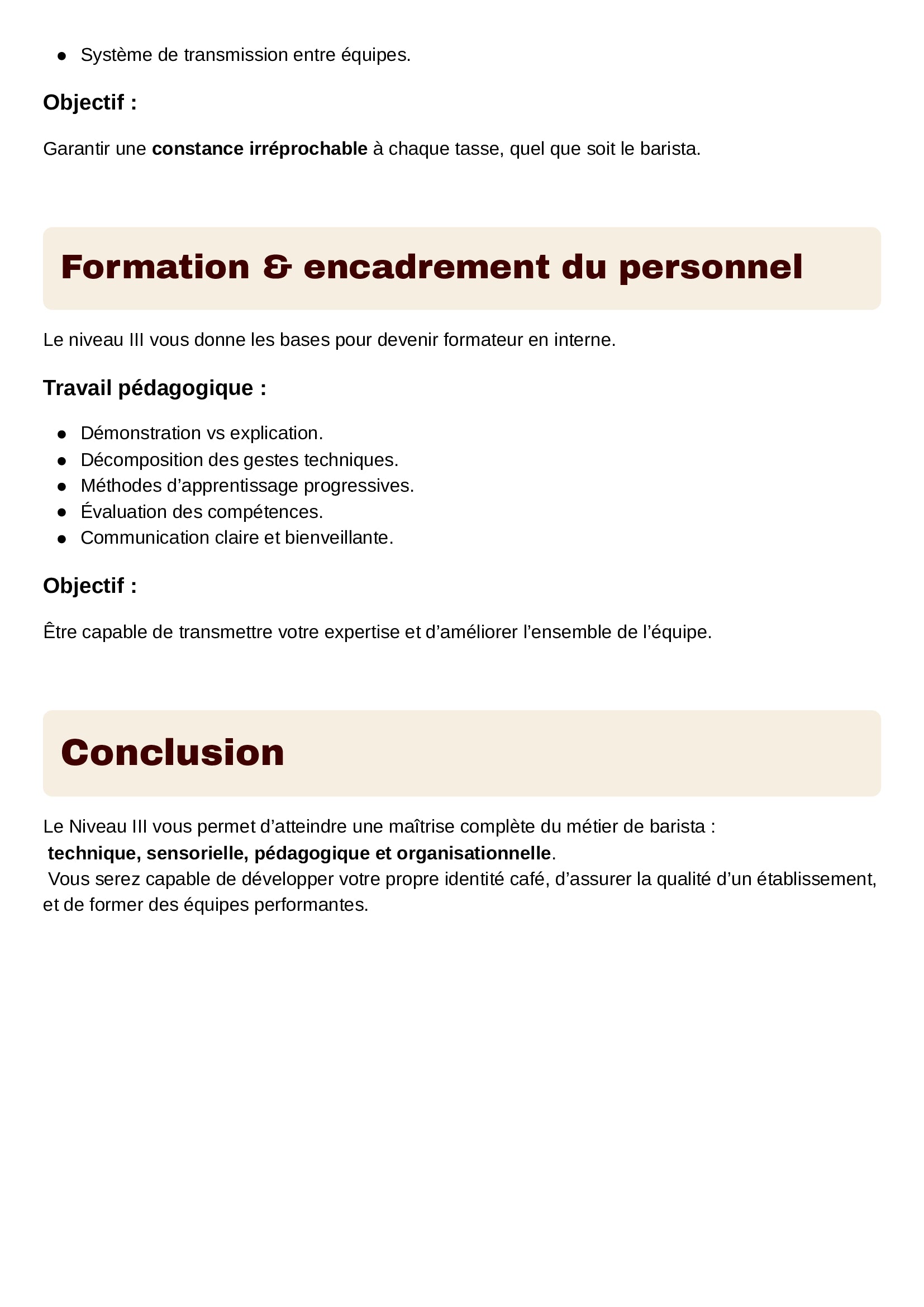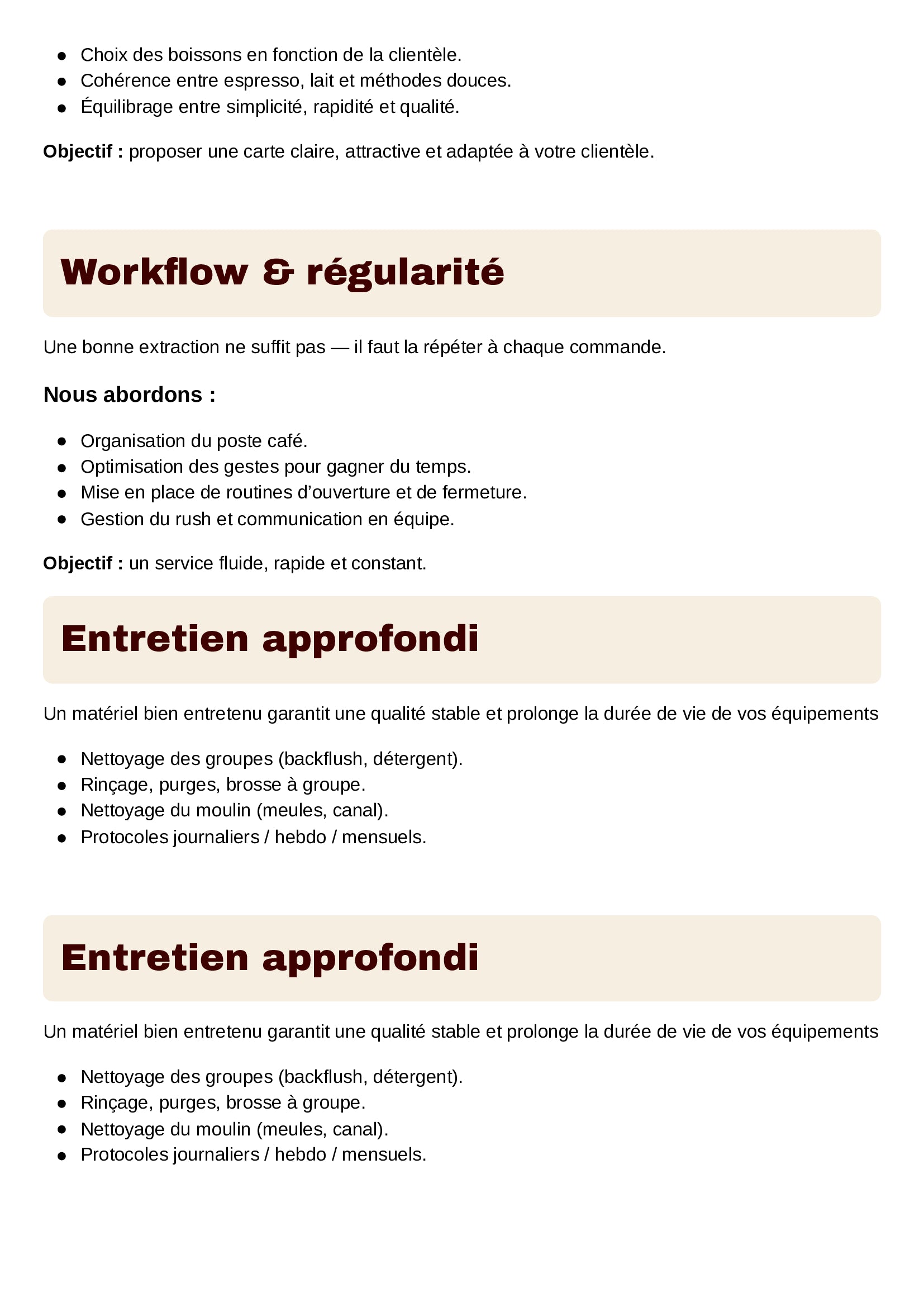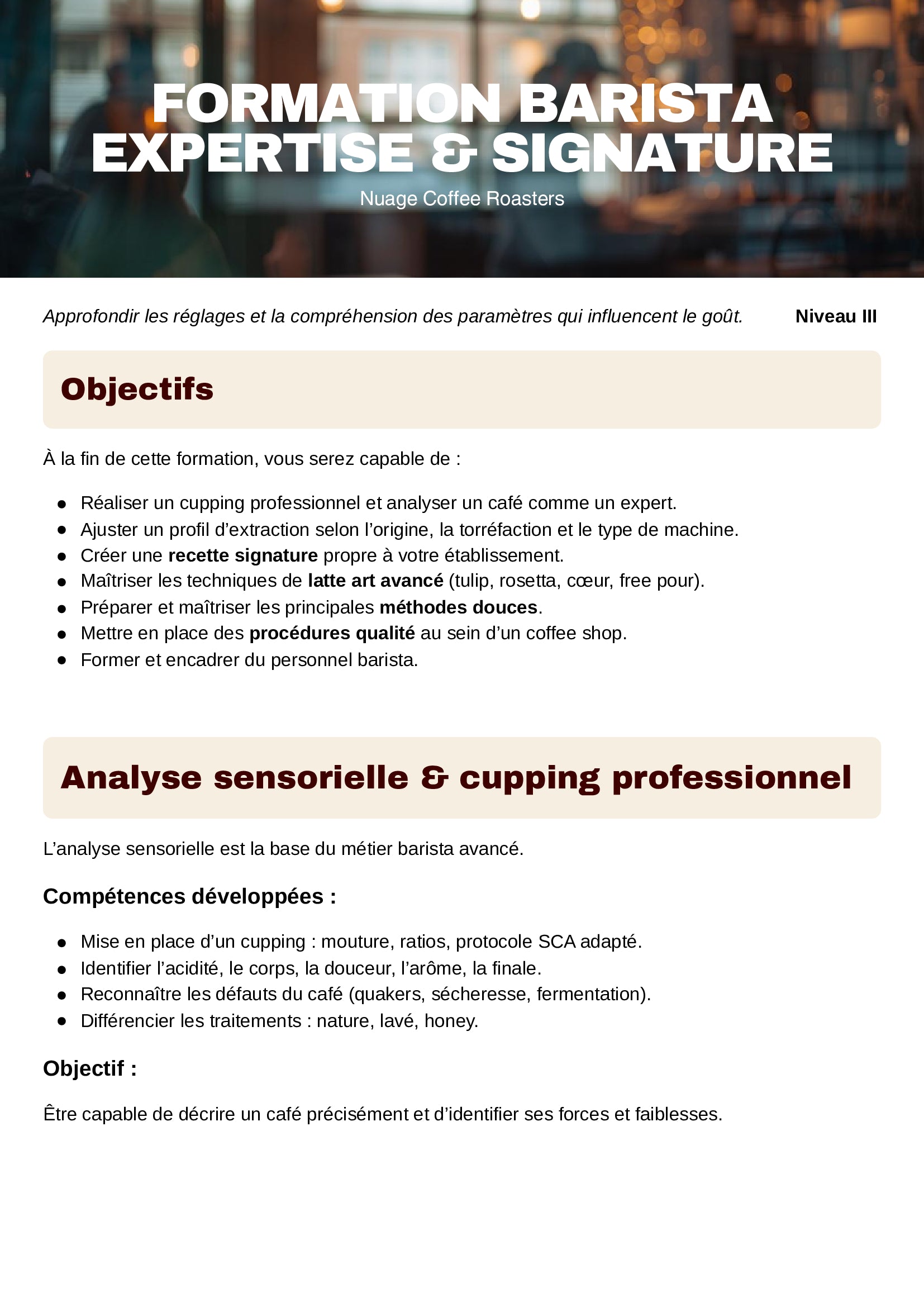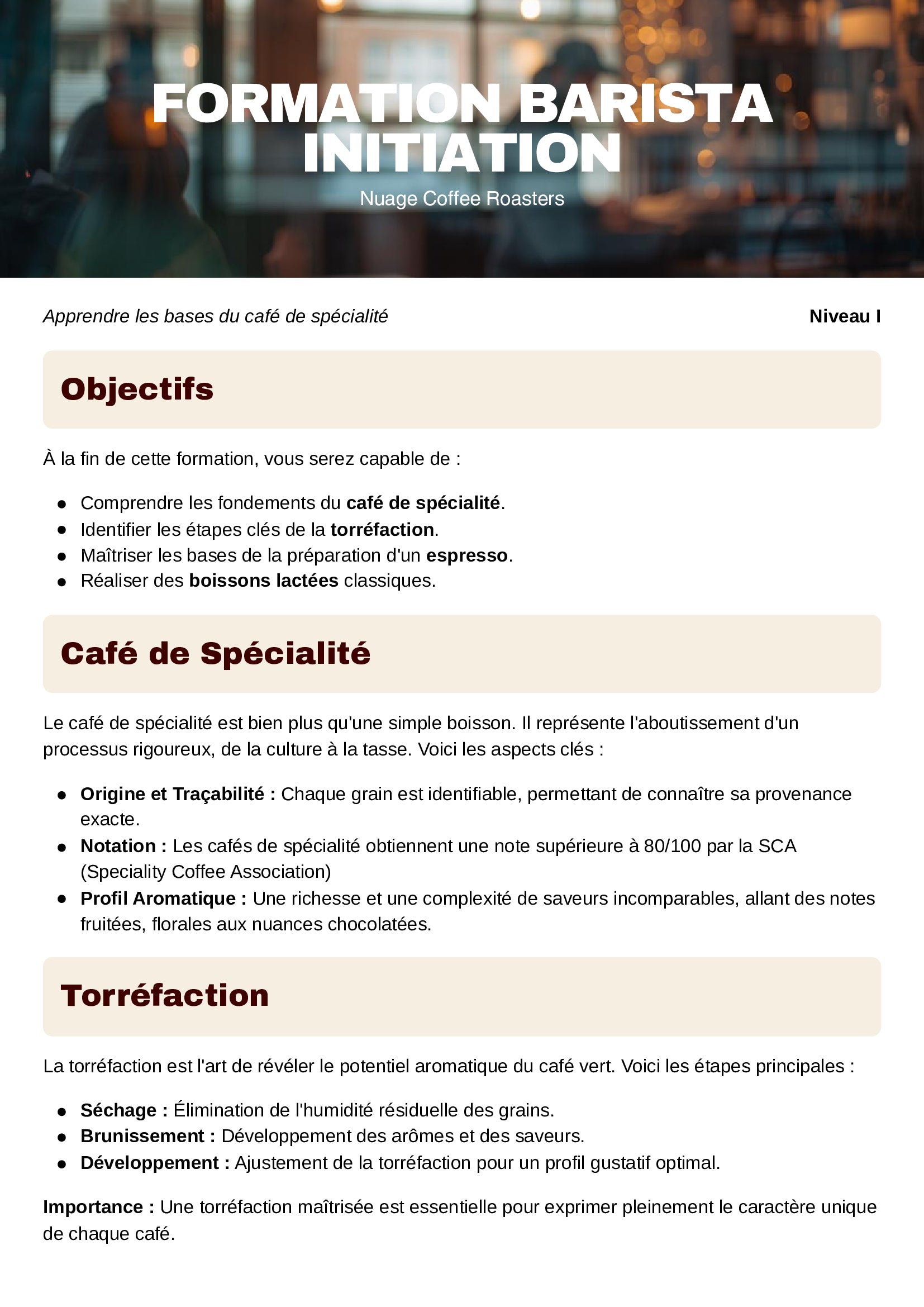 Au-delà de la fourniture des meilleurs grains, nous vous donnons les clés pour exceller dans la préparation. En tant que professionnels, vous avez accès à notre Académie Barista, proposant des formations complètes allant du Niveau I au Niveau III. Que vous souhaitiez former une nouvelle recrue aux bases de l'extraction, ou perfectionner vos baristas experts sur l'art du Latte Art et la gestion d'un moulin de précision, nos modules sont conçus spécifiquement pour vous. Investissez dans la compétence de vos équipes pour transformer chaque tasse en une expérience mémorable et garantir une qualité de service irréprochable à votre clientèle.